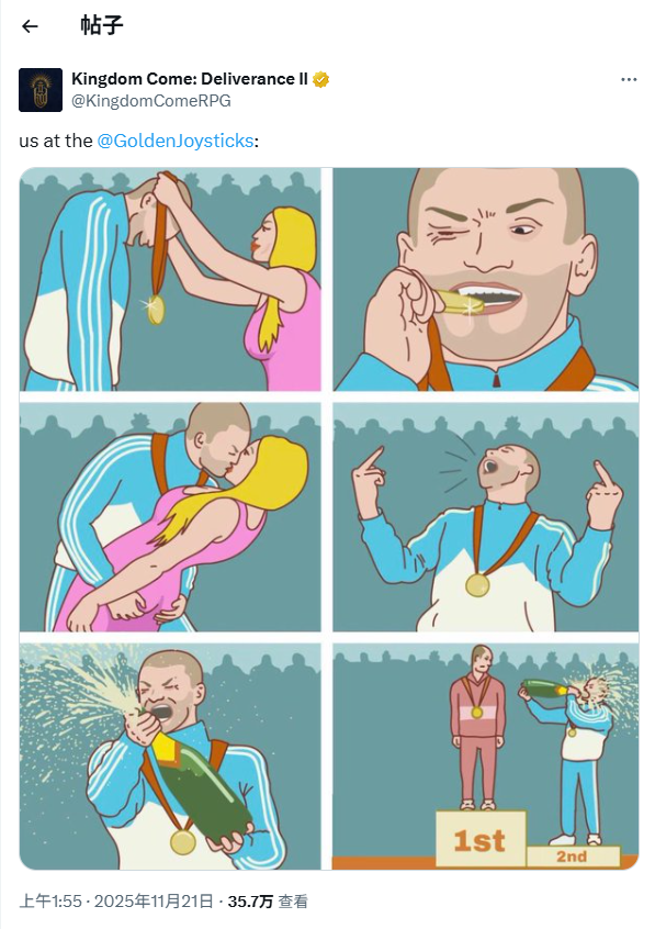 面对这样的结果,《天国:拯救2》官方并未显得沮丧,反而在社交平台X上发布了一张经典梗图进行自嘲,展现了其幽默风趣的一面。这一举动也赢得了不少玩家的理解和支持。