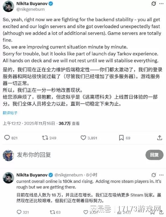 面对这场公关与技术双重危机,开发商Battlestate Games老板Nikita Buyanov已公开道歉,承认“发布过程确实很艰难”,并表示团队正在全力修复。