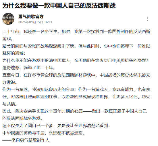 “我决定亲手实现这个童年时期就埋下的心愿——做出一款真正属于中国人自己的反法西斯战争游戏。”制作人坚定地表示,“这不仅是为了圆自己一个梦,更是为了让全世界都看到:中华民族在抗战中的英勇与不屈,永远都不该被遗忘。”