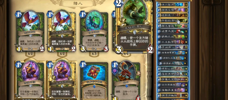 在国服传说前200分段,中速发现猎以绝对优势成为唯一T0卡组。该卡组凭借出色的泛用性,无论面对快攻还是控制卡组均有一战之力,且胜率持续保持高位。经过高手优化后的构筑中,「年轻的酒仙」成为核心组件,与「瓦纳斯」形成的回手combo堪称版本最强联动。玩家甚至可通过「游侠斥候」定向检索酒仙,进一步强化卡组稳定性。