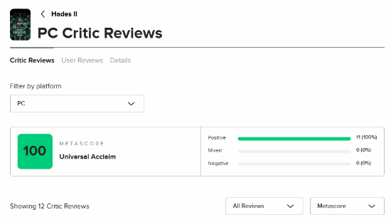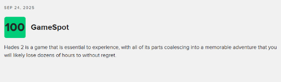 GameSpot同样给出了PC平台的满分100分评价,他们表示:“《哈迪斯2》是一款绝对值得体验的游戏,它的各个部分完美融合,构成了一段令人难忘的冒险之旅。即便你为此投入数十个小时,也定会毫无遗憾,收获满满。”