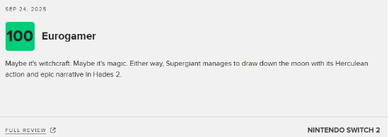 在众多评测中,Eurogamer给出了100分的满分评价,评测平台为Switch 2。他们盛赞道:“或许是巫术的神秘力量,或许是魔法的无尽魅力,Supergiant工作室在《哈迪斯2》中凭借其极具魄力的动作场面与宏大的叙事,成功打造出了一款堪称‘摘月’级别的佳作。”