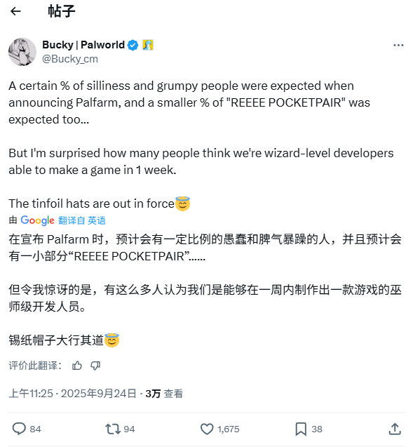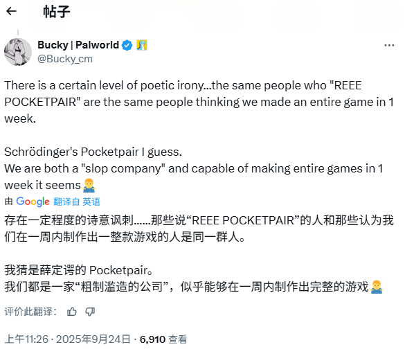 在随后的回复中,Bucky进一步指出,这种情况其实有点讽刺。那些对Pocketpair发泄敌意的人,同时也是坚信我们能在一周内完成整款游戏的人。他打趣道:“这大概就是薛定谔的Pocketpair吧,看起来我们既是‘糟糕的公司’,又能在一周内做出整款游戏。”并附上一个摊手表情,以表达自己的无奈。