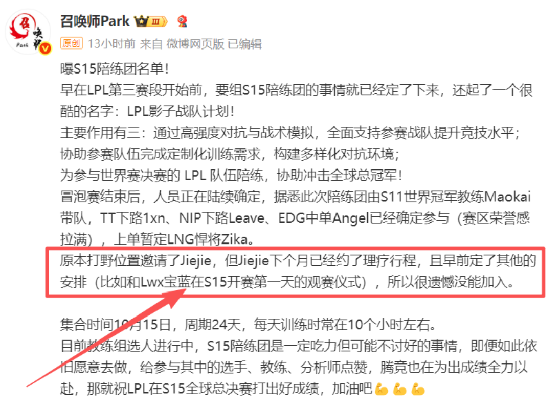 与此同时,召唤师Park还爆出了一则大消息。参加陪练的所有人从10月15日开始,需要进行为期24天的封闭式集训,每天的训练量在10个小时左右。这对于很多职业选手来说,无疑是一个巨大的挑战。