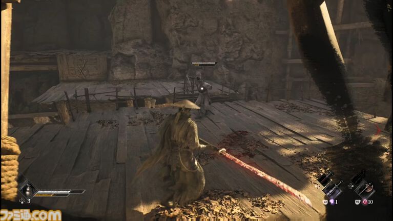 关卡采用立体结构,高处与远处的弓箭手构成主要威胁。被包围时,玩家需利用迂回路线与视野盲区展开突袭。例如,通过蹲下(L3键)避开敌人视线,从背后发动一击必杀。这种设计强调场景观察与优先级判断,而非单纯依赖操作技巧。