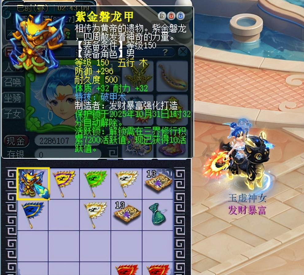 今日,又有一位幸运玩家在鉴定装备时,喜提一件150级初防296,体耐双加64的破甲男衣。这件衣服不仅初防高、双加高,而且非常适合当前版本。不过,最引人注目的还是玩家的昵称——“发财暴富”。看来,各位玩家在鉴定装备前,确实可以先琢磨个“吉利”的名字哦!