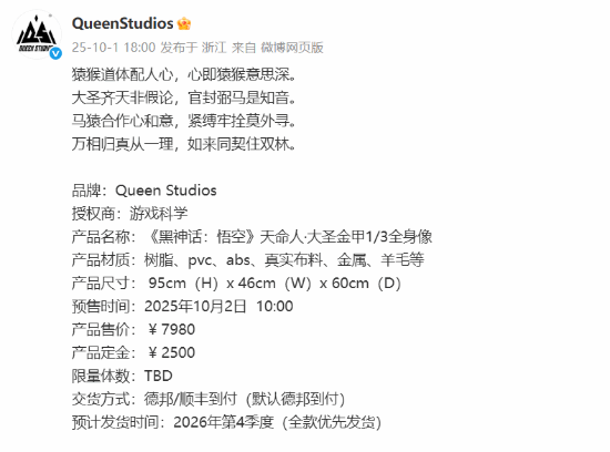 近日,QueenStudios官方正式公布了由游戏科学官方授权的《黑神话:悟空》天命人·大圣金甲1/3全身像,这款手办以7980元的亲民价格吸引了众多收藏爱好者的关注。此前,该系列曾推出过一款售价高达99800元的1/1全身像,限量99体,尺寸达到了惊人的272cm(H)x 180cm(W)x 131cm(D),预售时间为2025年10月2日10:00,预计发货时间为2026年第4季度(全款优先发货)。