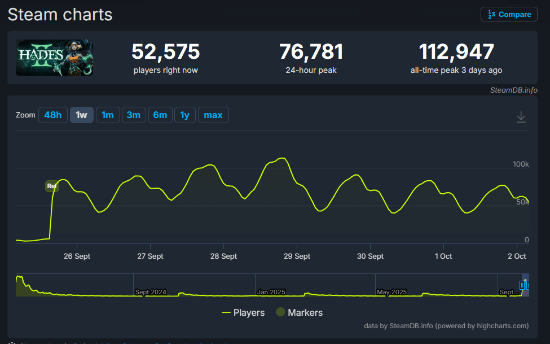 自正式发售以来,roguelike类型游戏《哈迪斯2》迅速成为现象级作品。据统计,其正式版发布后玩家峰值人数轻松超越前作,并在首个周末创下112,947人的在线新高。更值得关注的是,近48小时内游戏最低在线人数仍保持在4万人以上,展现出强劲的持续热度。