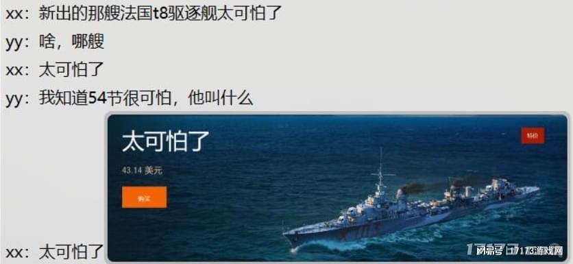 于是乎,这个离大谱的译名迅速在玩家社区走红,诞生出了大量诸如“新上线的法国驱逐舰太可怕了!它是很可怕但叫什么名字?太可怕了!”这样的谐音梗。