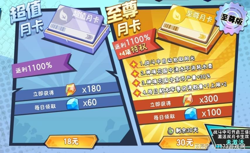 其次就是和前作一样的商业化策略问题。还是那句话,免费游戏采用内购盈利无可厚非,但不得不说,三代的吃相是有点难看了,就差把“Pay to win”(付费获胜)写在脸上了。比如,游戏的月卡设计,表面看着有“超值”和“至尊”两档供选择,实际上,诸如自动拾取阳光、无限扫荡等核心便利功能,都被捆绑在价格更高的“至尊”档位中。看似开放的题型,实则有且仅有唯一解。