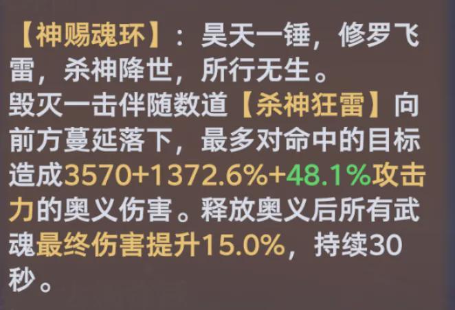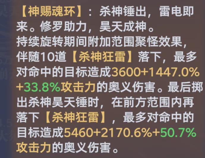 当唐昊的神赐魂环装配至1技能猛兽系时,其核心价值在于触发多重「杀神狂雷」效果。这与锤三神赐魂环激活1技能奥义的机制高度相似,但唐昊版本在输出频率与爆发强度上实现了质变。