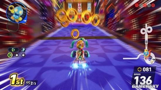 金环收集系统延续《索尼克》经典设定,撞障碍或被攻击会掉落金环,积累100枚可达成最大速度。漂移充能、尾流加速、空中特技等技巧构成操作上限,新手可依赖道具与随机地图取胜,高手则能通过精细操作展现华丽连招。