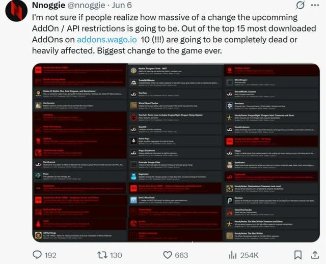 早在今年六月份,著名插件开发者Noggie就透露了暴雪将禁止插件访问实时战斗日志和光环的权限。这一变动直接切断了插件获取游戏数据的关键途径,导致依赖这些数据的战斗插件无法正常运行。据统计,当时排名前45的插件中有15款因此失效,而这些插件往往是玩家们打本时的必备工具。
