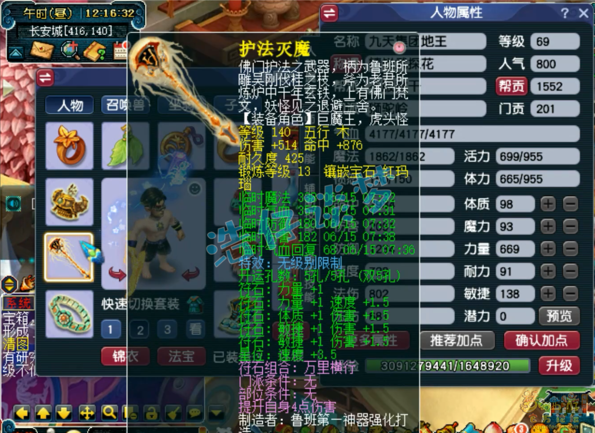 首先,我们来看看这位69级狮驼岭打符之后的面板属性,高达2091的伤害,对于69级玩家来说,已经是非常极限了。