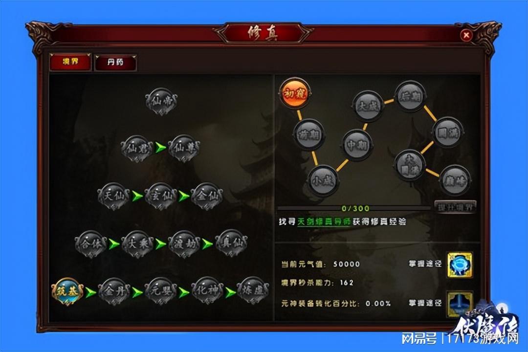 对于玩家来说,修仙的终极期待莫过于“境界突破”的真实感。如果一蹴而就,打遍天下无敌手,那也未免太过无趣。《伏魔传》深谙此道,专门构建了15个大境界、9个小阶段的完整修仙体系。