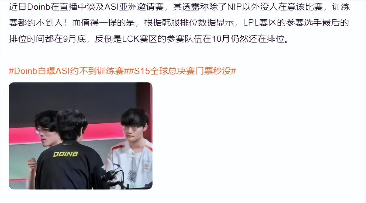 10月5日深夜,前世界冠军中单Doinb在直播间抛出一颗深水炸弹:“除了NIP,JDG和WBG根本没约训练赛——我们像个小丑,人家根本不重视这个比赛!”这番自嘲,瞬间点燃了电竞圈的讨论热潮。作为ASI的参赛选手之一,Doinb的控诉并非孤例,而是道出了这场赛事现阶段的尴尬处境。