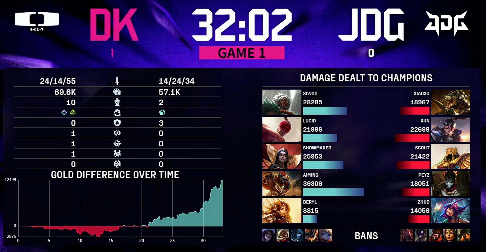 然而,进入中期后,JDG开始出现失误。20分钟时,DK在上半野区成功抓死JDG下路双人组,并顺势拿下厄塔汗。28分钟,DK上野尝试偷大龙,JDG赶来阻止,但DK果断放弃打龙直接开团,Lucid的盲僧发挥出色,DK打出1换4后成功拿下第一条大龙。最终,在30分钟时,Lucid的盲僧在高地乱秀,DK打出1换5团灭JDG,赢得首局胜利。首局伤害最高的是Aiming的炸弹人。