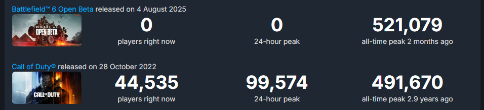 具体到Steam平台,《黑色行动7》B测期间的最高在线玩家数达到了9万9514名。然而,与《战地6》的玩家规模相比,这一数字仅仅是其五分之一,无疑凸显了《使命召唤》系列的衰落趋势,以及《战地》系列的强势回归。
