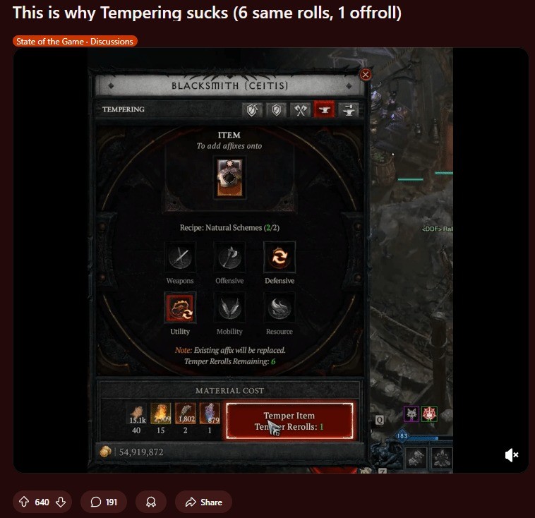 淬炼机制的设计初衷是让玩家能够更自主地定制装备,使其更契合特定的职业流派或玩法。但在实际运行中,其高度随机的设定引发了大量争议。不少玩家甚至将其称为“最糟糕的设计”。例如,Reddit用户stormalong128就分享了自己的遭遇:他在使用自然配方淬炼装备时,连续五次获得了“屏障生成”词条,最终却以“荆棘”属性收尾。这一经历充分展现了淬炼机制的不可控性,也让玩家感到非常沮丧。