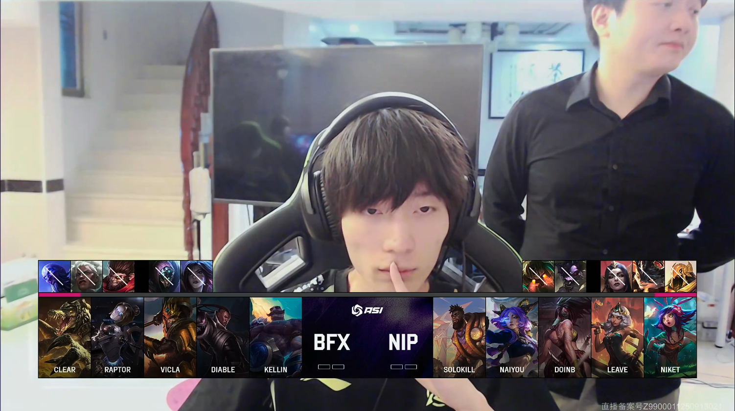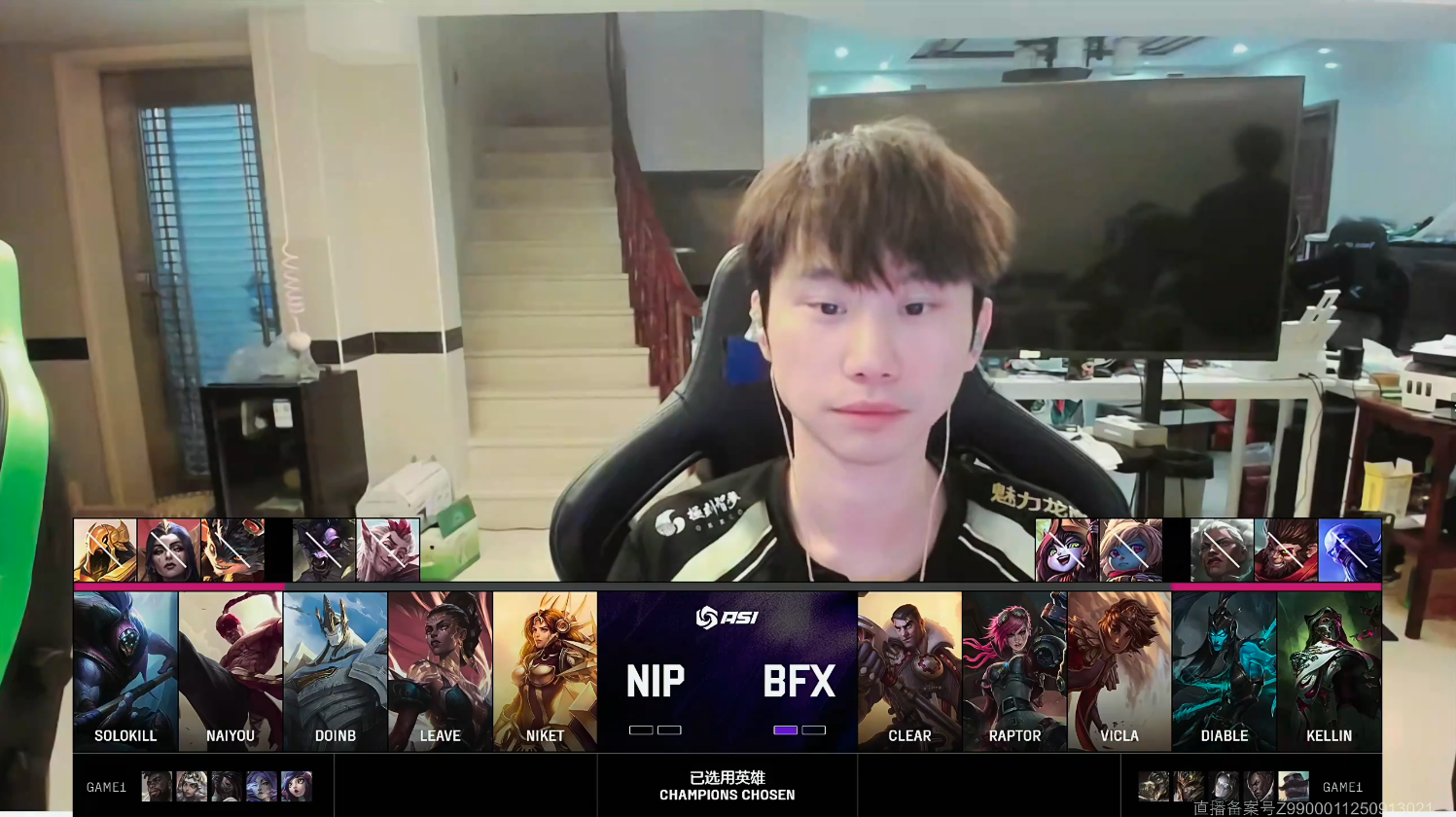 第一局比赛,BFX处于蓝色方,禁用英雄为:瑞兹、安蓓萨、猴子、贾克斯、卡莎,选用英雄为:Clear鳄鱼、Raptor皇子、VicLa发条、Diable卢锡安、Kellin布隆;NIP处于红色方,禁用英雄为:沙皇、兰博、乐芙兰、牛头、泰坦,选用英雄为:Solokill奎桑提、naiyou琪亚娜、Doinb阿卡丽、Leave芸阿娜、Niket妮蔻。