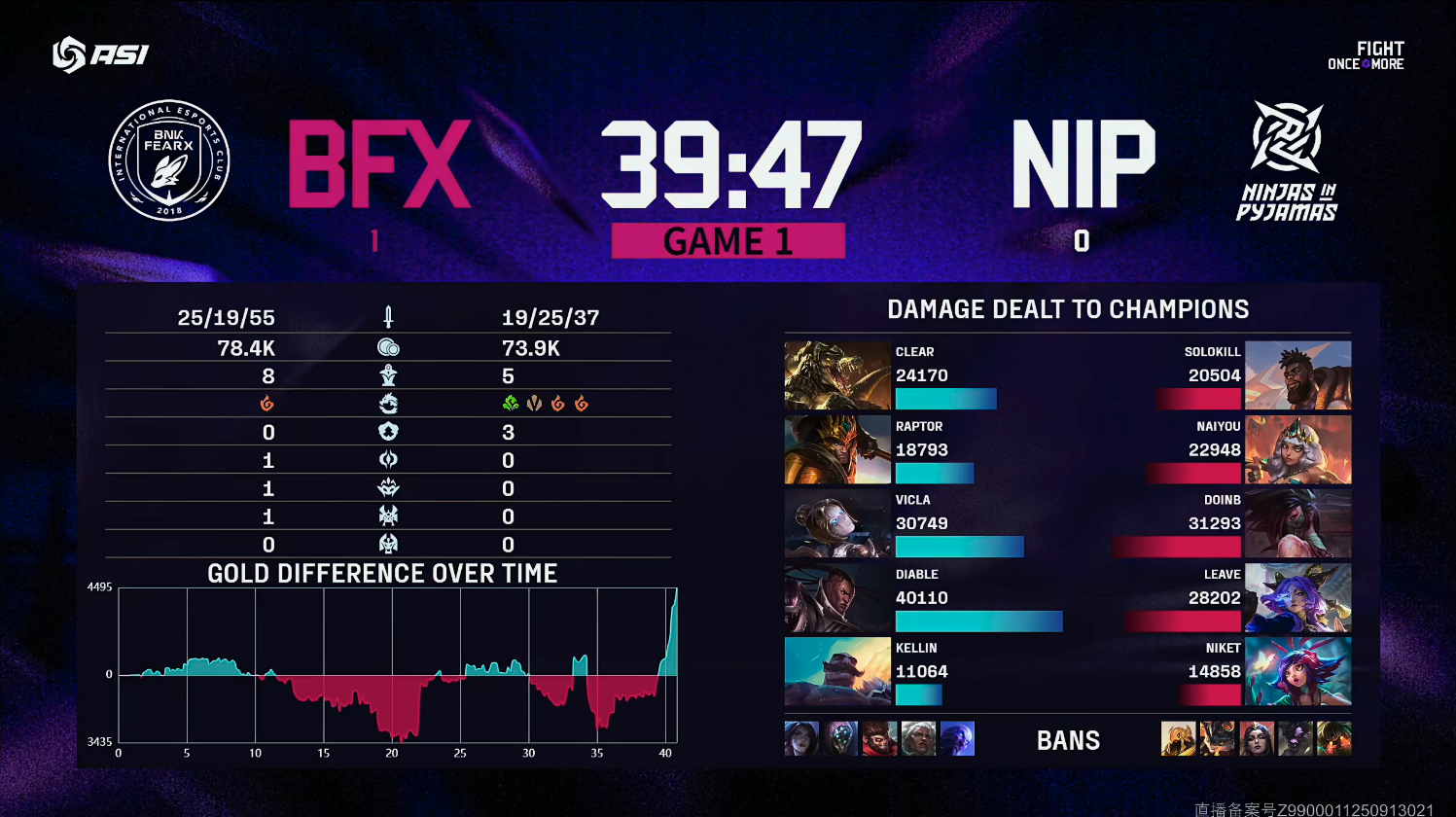 第一局比赛,双方从开场便激烈交锋,期间还经历了几次暂停。最终BFX笑到了最后。3分钟左右,BFX凭借换线视野设计,在上路成功击杀芸阿娜拿下一血;12分钟左右,NIP在上路团战中大获全胜,Doinb的阿卡丽完美连招收尾,再次击杀卢锡安;16分钟左右,琪亚娜成功控下第二条小龙,但鳄鱼赶来将其击杀;21分钟左右,BFX完美拉扯打出1换4,随后顺利控下厄塔汗;31分钟左右,BFX抓住机会连杀上辅两人,随后顺利控下大龙;33分钟左右,NIP完美开团瞬秒对方双C,随后强势控下火龙魂;最终在39分47秒,BFX打赢最终团战,先赢一局!