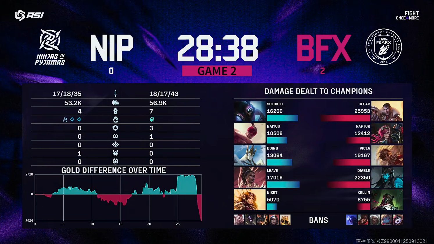 第二局比赛,两队依旧打得难解难分,然而NIP却因大龙决策失误而“毁一生”,最终又是BFX笑到最后。3分钟左右,Leave的梅尔升2秒学W防越塔成功,NIP下路最终打出1换2;7分钟左右,Doinb的加里奥大招支援四包二,双方最终打出2换2;20分钟左右,贾克斯战力拉满在团战中游龙,双方打出3换3,但NIP控下小龙;22分钟左右,BFX在野区发难击杀下辅两人,控下厄塔汗,但NIP同时换掉中二塔;25分钟左右,NIP团战完美拉扯大获全胜,击杀对方四人控下听牌龙;最终在28分38秒,NIP因大龙决策失误“毁一生”,BFX0换5,赢下比赛。