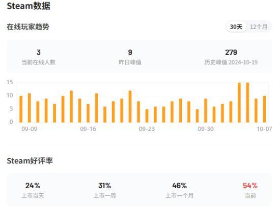 从Steam平台的数据来看,这款游戏的表现确实相当惨淡。在撰写本文时,仅有3名玩家在线,而昨日的在线峰值也仅仅是个位数——仅有9人。此外,该游戏的好评率也仅为54%,由于评价数量过少,甚至无法统计出最佳评测和简中区评测。