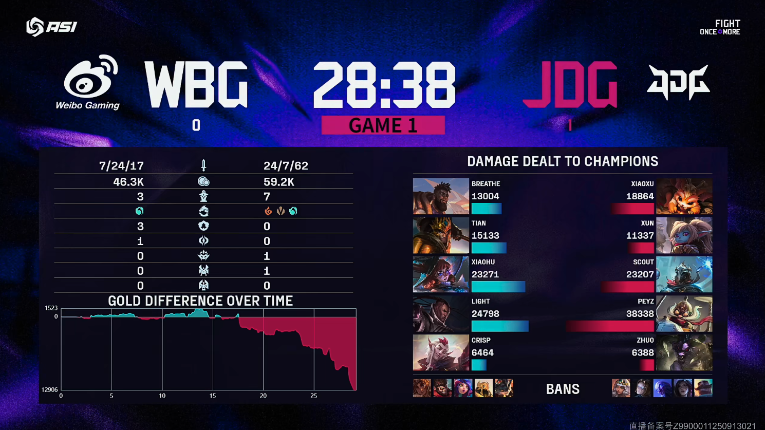 在第一局比赛中,WBG选择了蓝色方,并禁用了兰博、沙皇、妮蔻、猴子和岩雀等英雄,而JDG则选择了红色方,禁用了琪亚娜、发条、瑞兹、卡莎和布隆。双方的阵容选择都颇具针对性。比赛开始后,两队在前期打得异常胶着,经济差距一直未能拉开。然而,进入中后期后,JDG逐渐展现出了他们的实力。3分钟左右,双方中路爆发3v3团战,WBG的洛成功拿下一血,为队伍取得了前期优势。但随后,JDG逐渐找回了节奏,12分钟左右,Tian的下路皇子配合卢锡安成功击杀飞机,并推掉了下一塔。17分钟左右,纳尔再次变大战力拉满,JDG团战反打大获全胜,0换4奠定了优势。23分钟左右,Scout的维克托持续伤害拉满,JDG打出1换5的碾压局。26分钟左右,纳尔和飞机完美拉扯逆转局势,JDG再次打出ACE并控下大龙。最终,在28分38秒时,JDG团灭WBG,先赢一局!