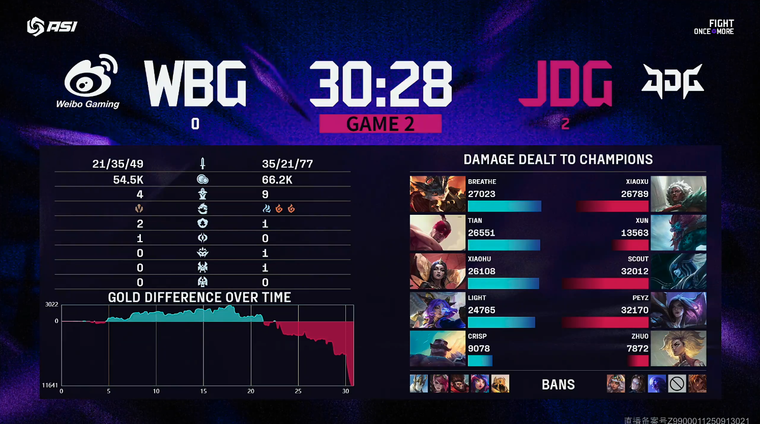 第二局比赛,WBG再次选择了蓝色方,并禁用了沙皇、妮蔻、猴子、蔚和加里奥等英雄,而JDG则禁用了琪亚娜、发条、瑞兹、空ban和岩雀。双方的阵容选择再次展现出了他们的战术思路。比赛开始后,两队各打半场好局。3分钟左右,双方上野2v2,JDG的巨魔战力更优,支援速度更快,配合安蓓萨成功击杀兰博拿下一血。7分钟左右,WBG中路多人集结拿下战斗先机,乐芙兰极限锁血打出0换2。17分钟左右,JDG先秒掉兰博,但Tian的盲僧操作拉满拿下三杀,双方多人互换。21分钟左右,JDG的进场阵容摧毁对手后排,团战大获全胜打出1换4并收下厄塔汗。24分钟左右,冰女被动输出拉满,安蓓萨收割残局,JDG团战再次取胜打出3换5。28分钟左右,冰女成功挡住乐芙兰完成击杀,随后JDG稳稳控下大龙。最终,在30分28秒时,JDG团灭WBG,赢下了比赛!