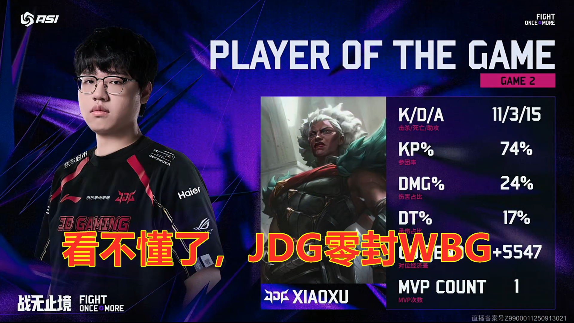最终,JDG以零封的战绩战胜了WBG,斩获了一个胜场。这样的结果确实有些让人看不懂,JDG在昨天的比赛中输了,而今天却赢了;WBG则是昨天赢了,今天却输了。这不禁让人想起了那句“对外唯唯诺诺,对内重拳出击”的调侃。不过,无论如何,这场比赛都为我们带来了精彩的视觉盛宴,也让我们更加期待即将到来的S15全球总决赛。