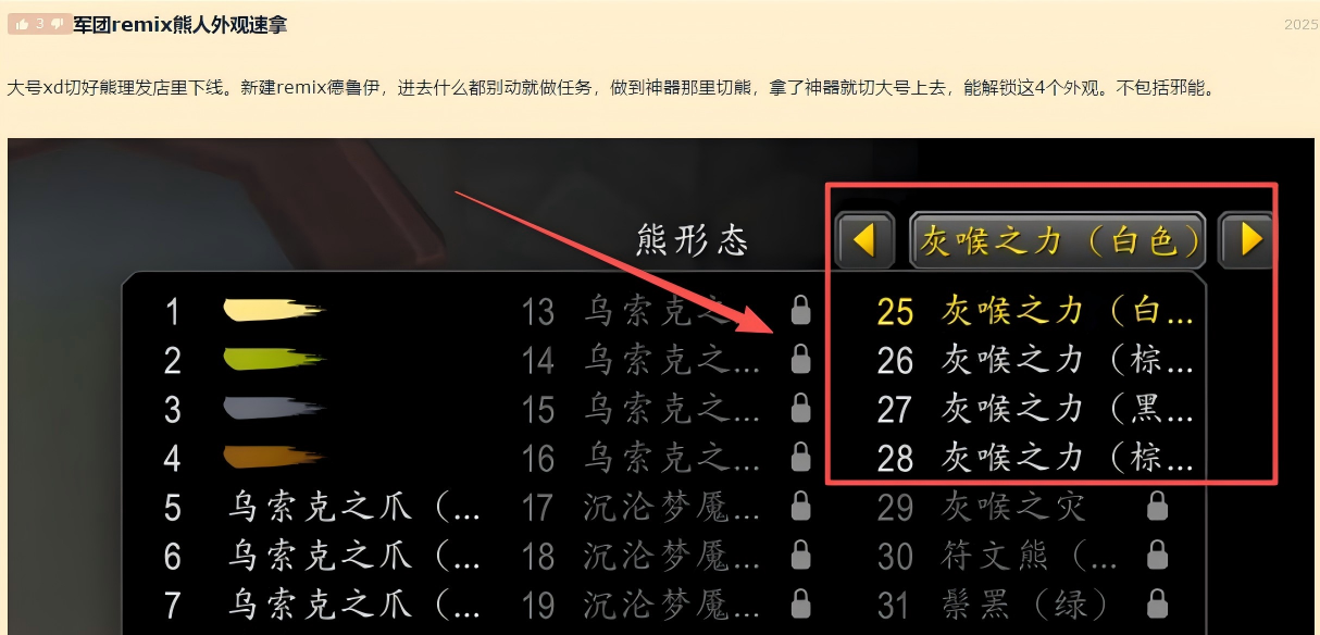 小德职业的特殊外观已确认可在Remix模式中快速解锁。其中熊德的「灰喉之力」外观仅需完成神器任务线即可获得,并支持同步至其他角色。对于追求外观收集的玩家,首发德鲁伊可大幅提升效率。