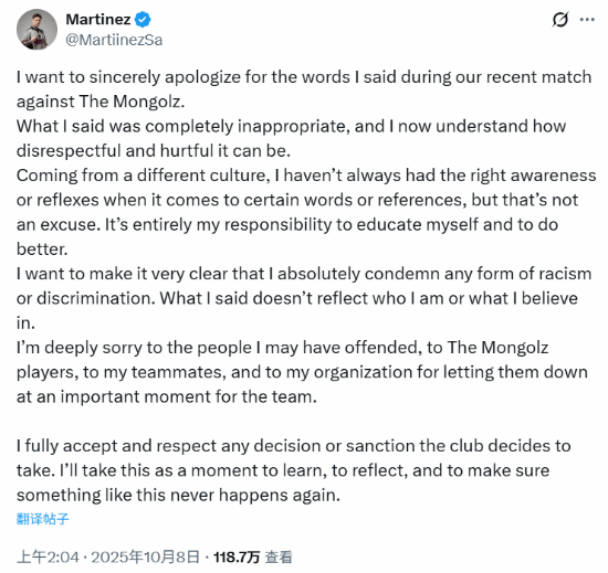 Martinez在道歉声明中表示:“在此,我为自己在与The Mongolz战队比赛中的不当言论诚恳致歉。我的言论极为不妥,也让我深刻认识到其中包含的不敬与伤害。由于文化背景的差异,我过去对某些词汇和指代的敏感性缺乏足够的认知,但这绝非借口。主动学习、完善自我始终是我的责任。”