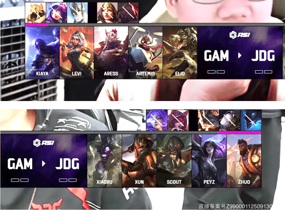 首局比赛GAM(蓝色方)禁用沙皇、妮蔻等英雄,选用鳄鱼、奇亚娜的强势组合;JDG(红色方)则以奎桑提、皇子应对。比赛前期JDG取得1500经济优势,但第20分钟Levi奇亚娜三杀成为转折点。GAM通过连续团战掌控局势,第41分钟龙魂团0换3后终结比赛。