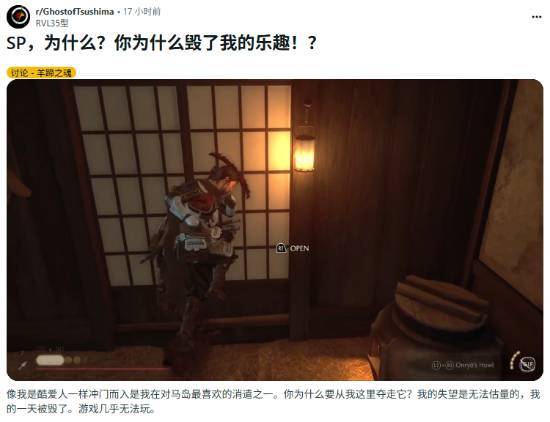 该网友表示,在玩《对马岛之魂》时,自己特别喜欢用角色撞破障子(日式纸门),那种破门而入的快感让人欲罢不能。然而,在新作《羊蹄山之魂》中,新主角笃虽然外表彪悍,但在尝试用肘击撞门时,却发现纸门纹丝不动,自己反而因为冲撞而吃了个暗亏,再也没有了前作中的那种畅快淋漓的感觉。