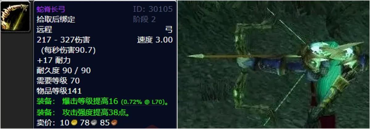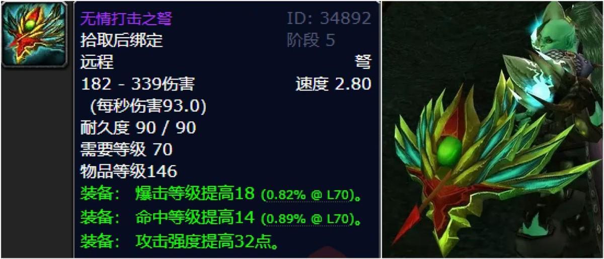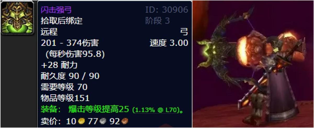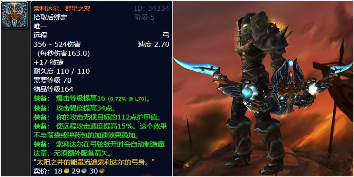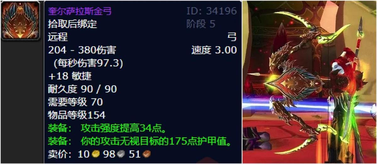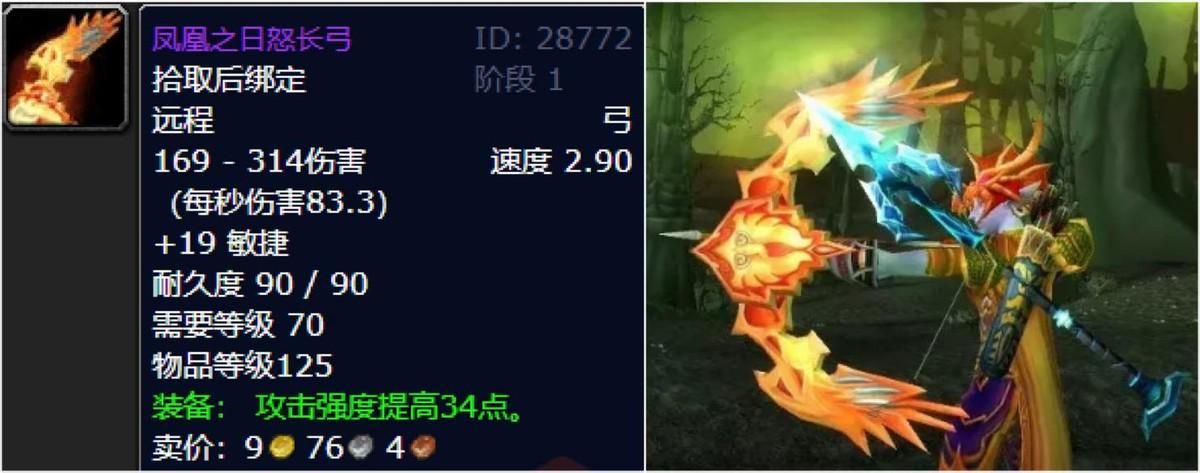 卡拉赞玛克扎尔王子掉落的凤凰之日怒长弓,堪称经典中的经典。喵叔当年为了这把弓,刷了不知道多少次卡拉赞,结果脸黑到怀疑人生。不过在怀旧服时期,我战士号居然300金币就收藏了一把,你敢信?
