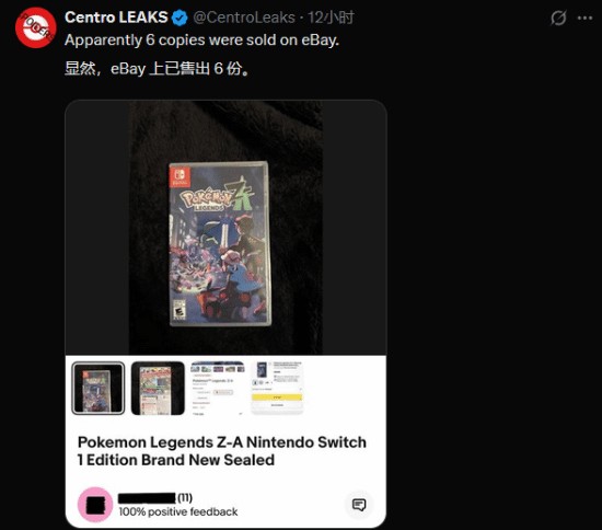 此外,@CentroLeaks还在另一篇推文中补充表示,目前在二手交易平台eBay上,已经有多份《宝可梦传说:Z-A》的实体版被售出,数量至少达到了6份。这一数据进一步证实了实体版偷跑的事实,也让更多玩家对游戏的正式发售充满了期待与好奇。