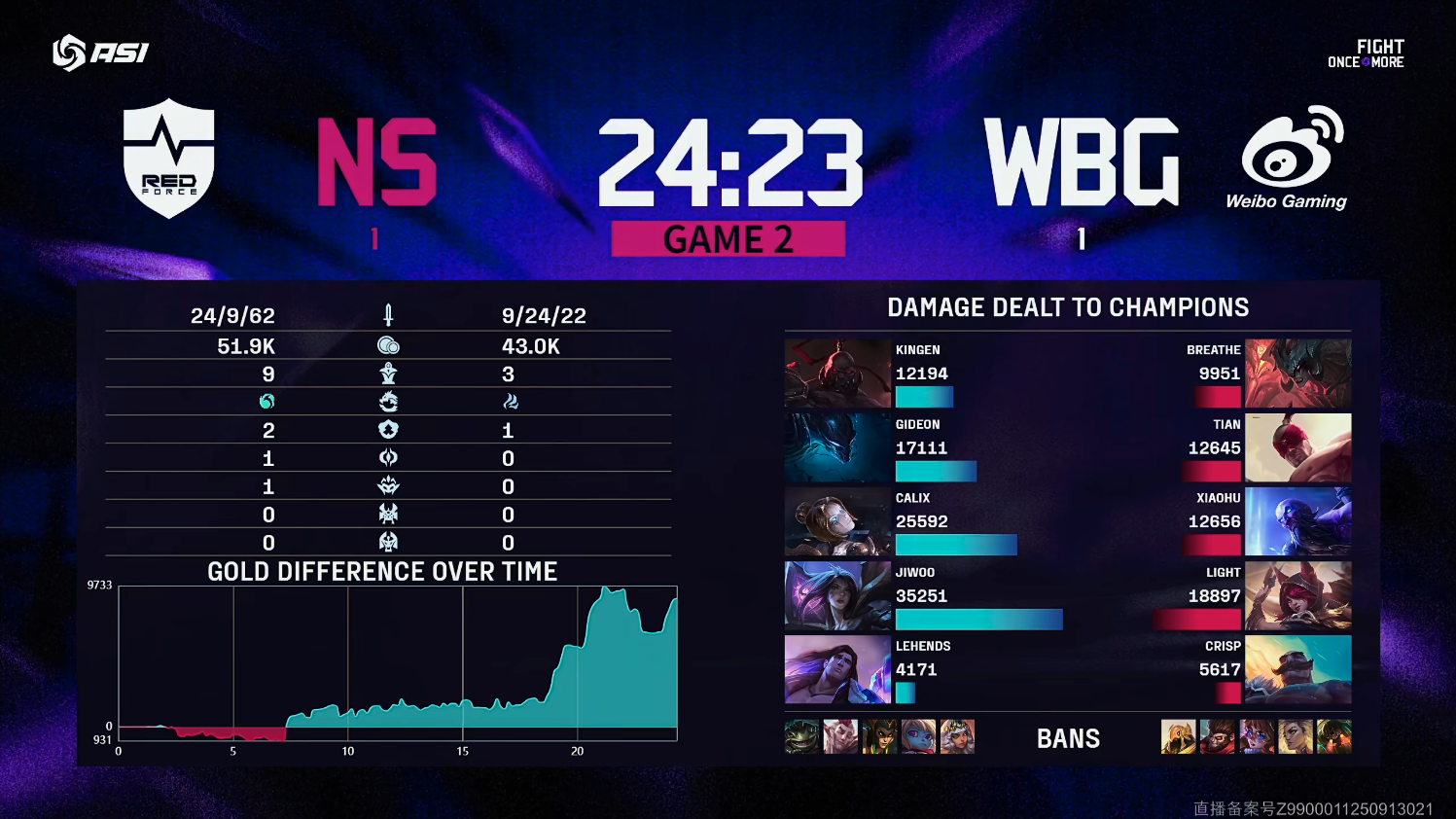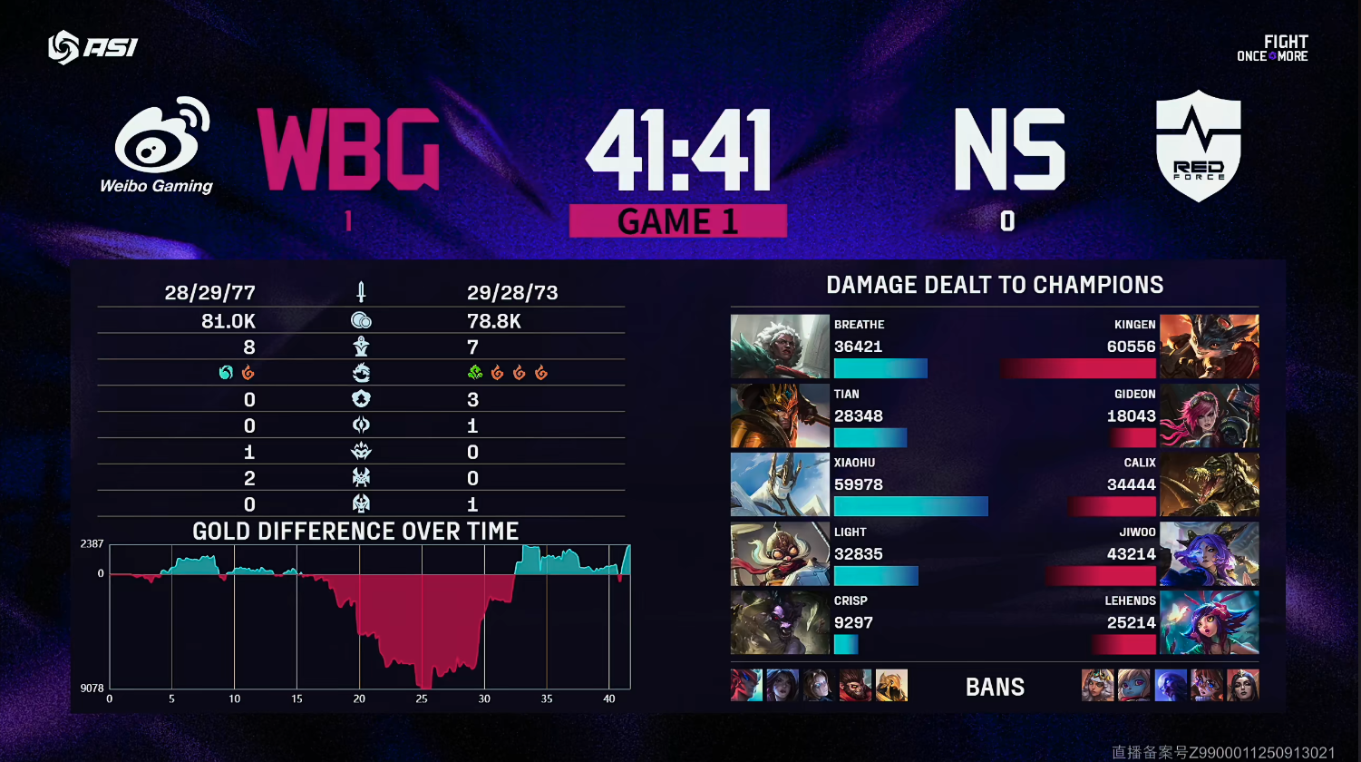比赛伊始,NS野区入侵遭遇WBG下路快速支援,Tian皇子双杀打出1换2。8分钟,NS控下三只巢虫;19分钟,NS推掉上二塔并击杀三人。25分钟,WBG强行rush大龙被团灭,但30分钟野辅控制链切死芸阿娜,WBG扳回劣势。32分钟,Xiaohu加里奥配合安蓓萨进场,WBG打出ACE控下大龙。最终41分41秒,WBG远古龙团灭NS,先声夺人。