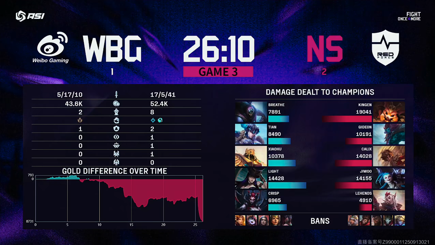 7分钟,WBG配合失误致女警被塔击杀,Lehends洛收下一血;8分钟,巨魔柱子卡住女警位置,NS拿下战斗先机;14分钟,NS下路打出0换2推掉下一塔。22分钟,NS控下小龙;最终26分10秒,NS强势控下大龙后一波终结比赛。