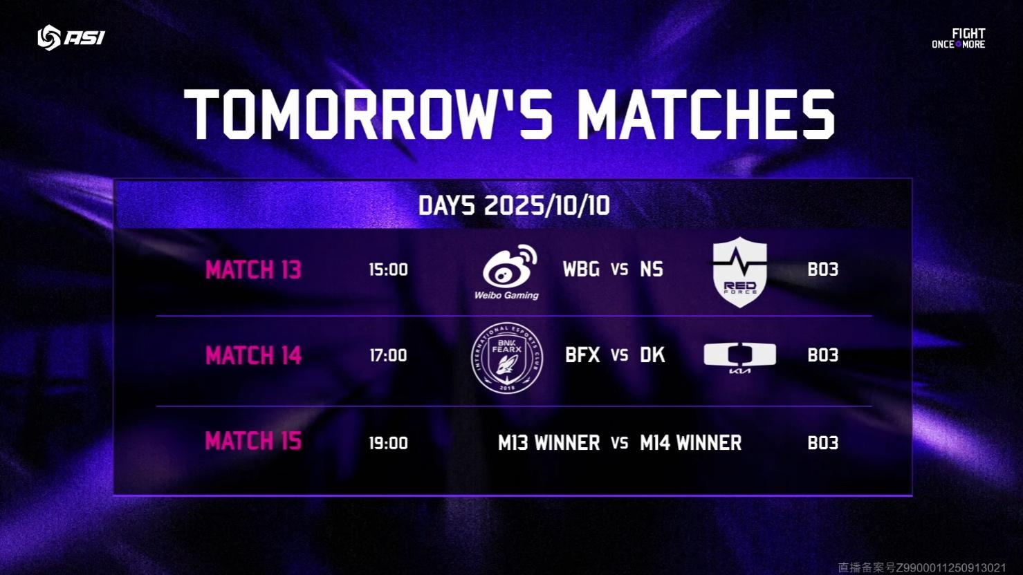 10月10日的赛程安排了三场焦点对决:WBG对阵NS、BFX迎战DK,以及M3与M4胜者的终极较量。首场比赛中,NS以3:0战胜WBG;DK则以零封姿态击败BFX。当DK与NS在胜者组决赛相遇,这场强强对话注定将点燃赛场激情。