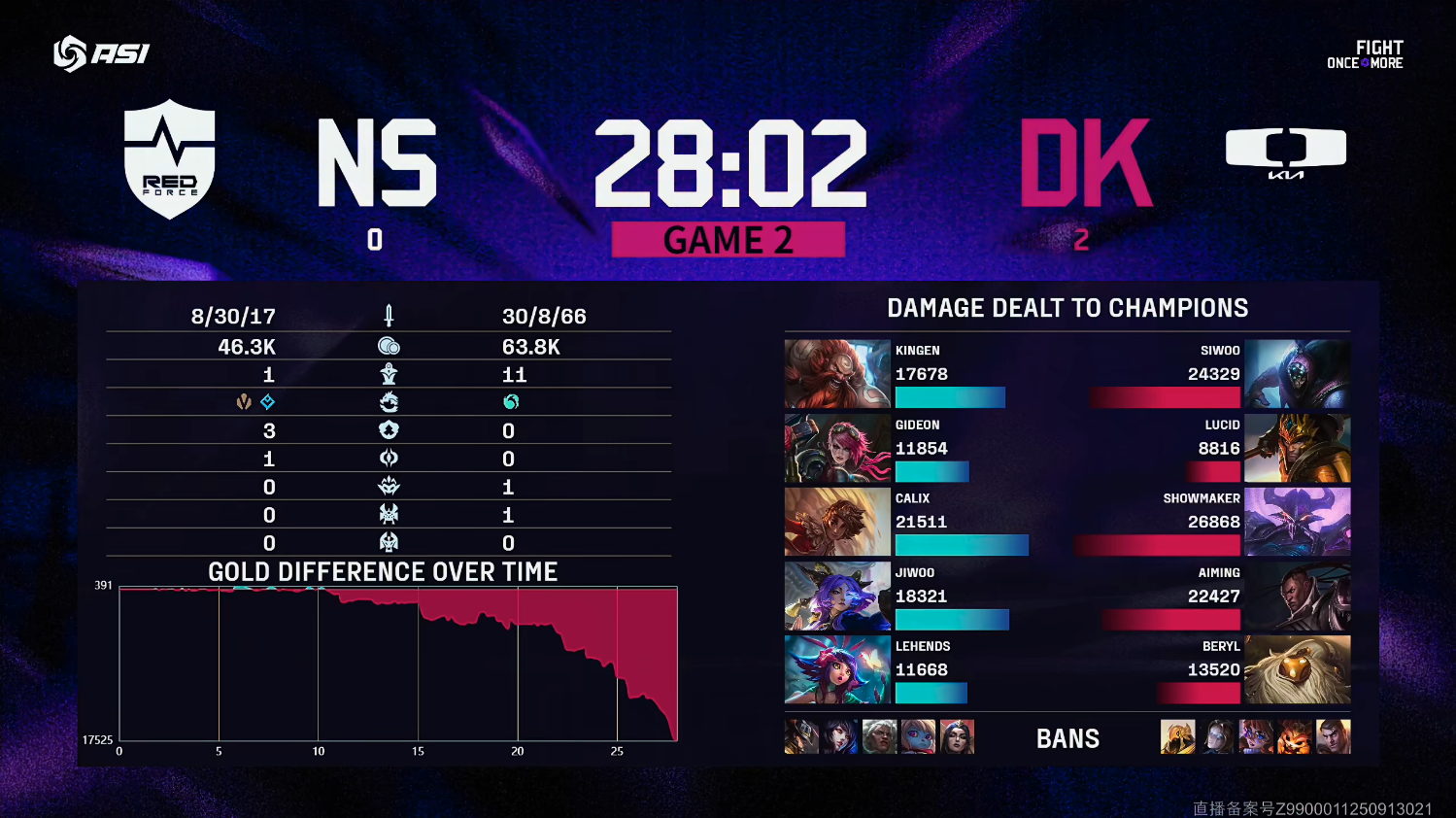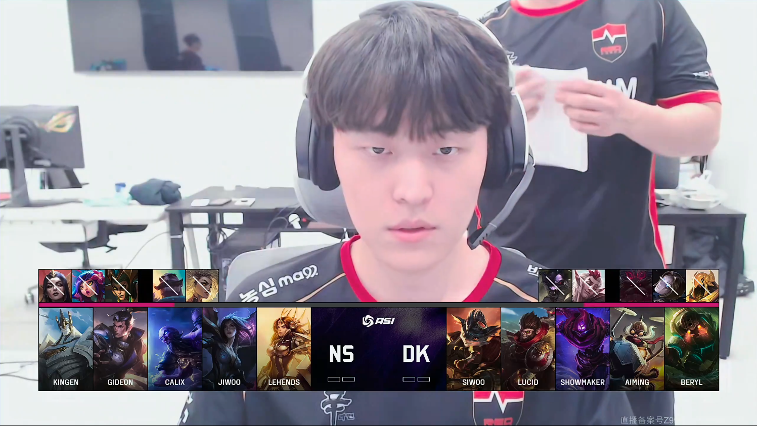 NS(蓝色方)禁用妖姬、波比、安蓓萨、阿狸、卡牌,选用Kingen酒桶、GIDEON蔚、Calix岩雀、Jiwoo芸阿娜、Lehends妮蔻;DK(红色方)禁用沙皇、发条、阿萝拉、纳尔、杰斯,选用Siwoo贾克斯、Lucid皇子、ShowMaker卡萨丁、Aiming卢锡安、BeryL巴德。