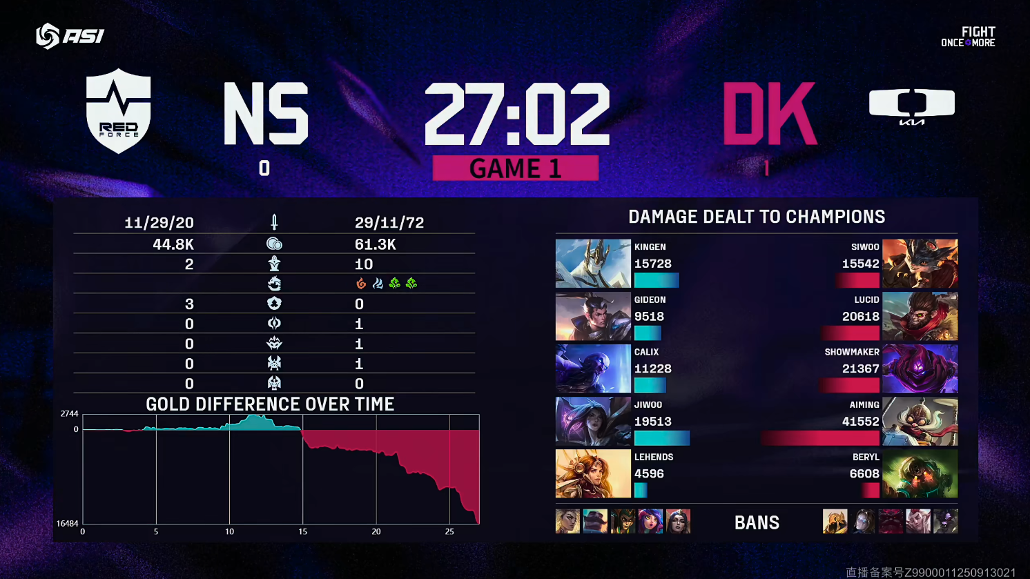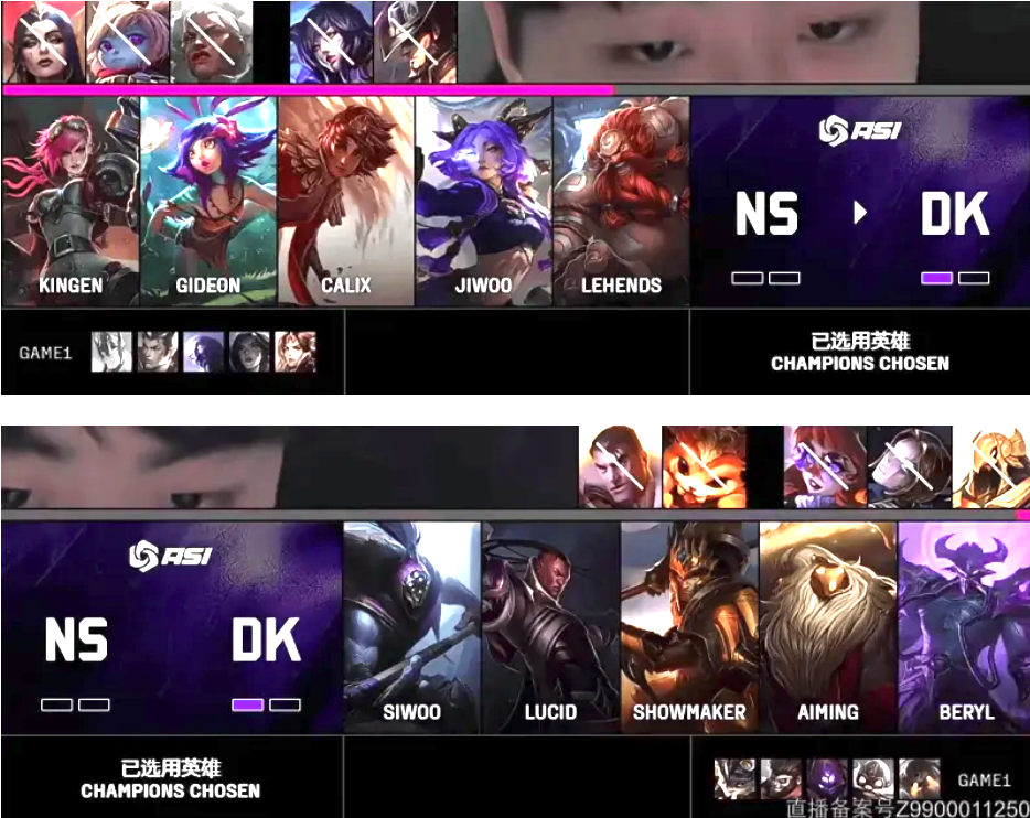 NS(蓝色方)禁用妖姬、妮蔻、蛇女、布隆、芮尔,选用Kingen加里奥、GIDEON赵信、Calix瑞兹、Jiwoo卡莎、Lehends蕾欧娜;DK(红色方)禁用沙皇、发条、奥恩、洛、牛头,选用Siwoo兰博、Lucid猴子、ShowMaker马尔扎哈、Aiming飞机、BeryL泰坦。