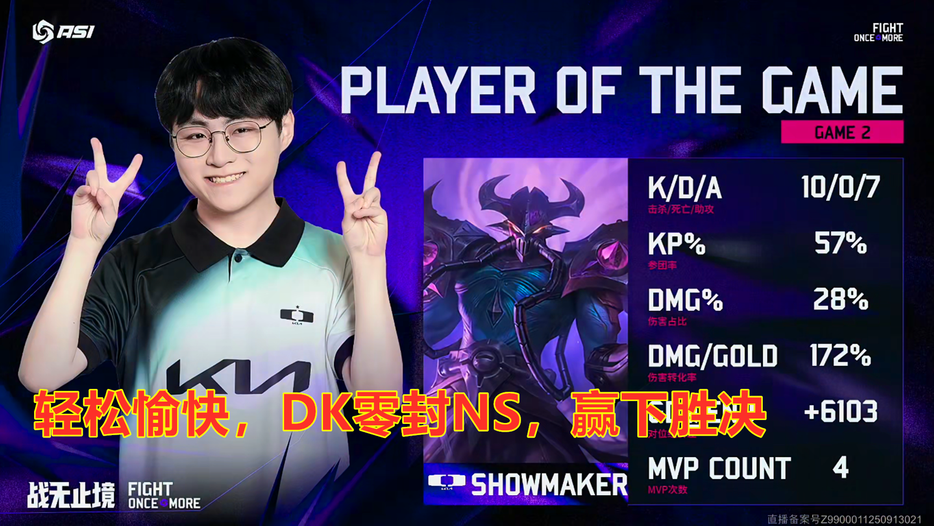 比赛第15分钟,DK在野区混战中打出1换4;第21分钟中路团战再以1换4大胜,经济差迅速拉开。第24分钟,ShowMaker卡萨丁野区团战斩获伪三杀,DK以0换4彻底掌控局势。最终在第28分钟,DK携大龙Buff一波结束比赛。