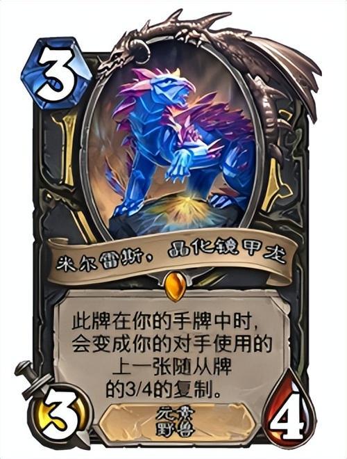 米尔雷斯·晶化镜甲龙获得+1生命值增强,属性从3/3调整为3/4。值得注意的是,设计师历来对盗贼职业卡的加强多集中于生存能力提升,此次调整延续了这一传统设计思路。