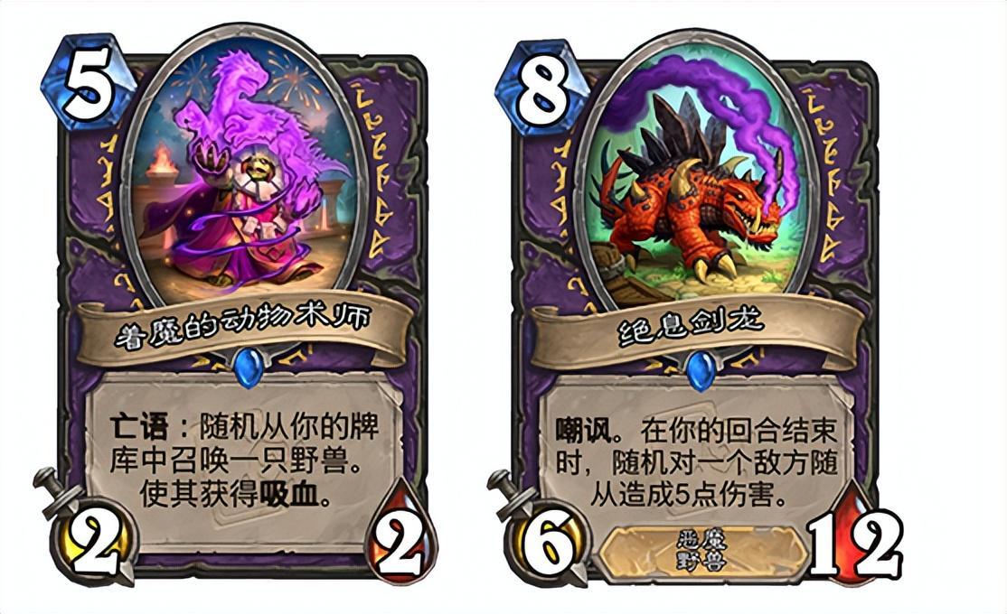 “着魔的动物术师”与“绝息剑龙”双双降低1费,前者从6费降至5费后与摩天龙体系契合度显著提升;后者虽增加2点生命值,但实际对战价值仍显鸡肋。“甲龙”的改动堪称本次亮点,费用从8费削减至6费,属性调整为7/5,中速猎卡组将因此获得更强节奏掌控力。