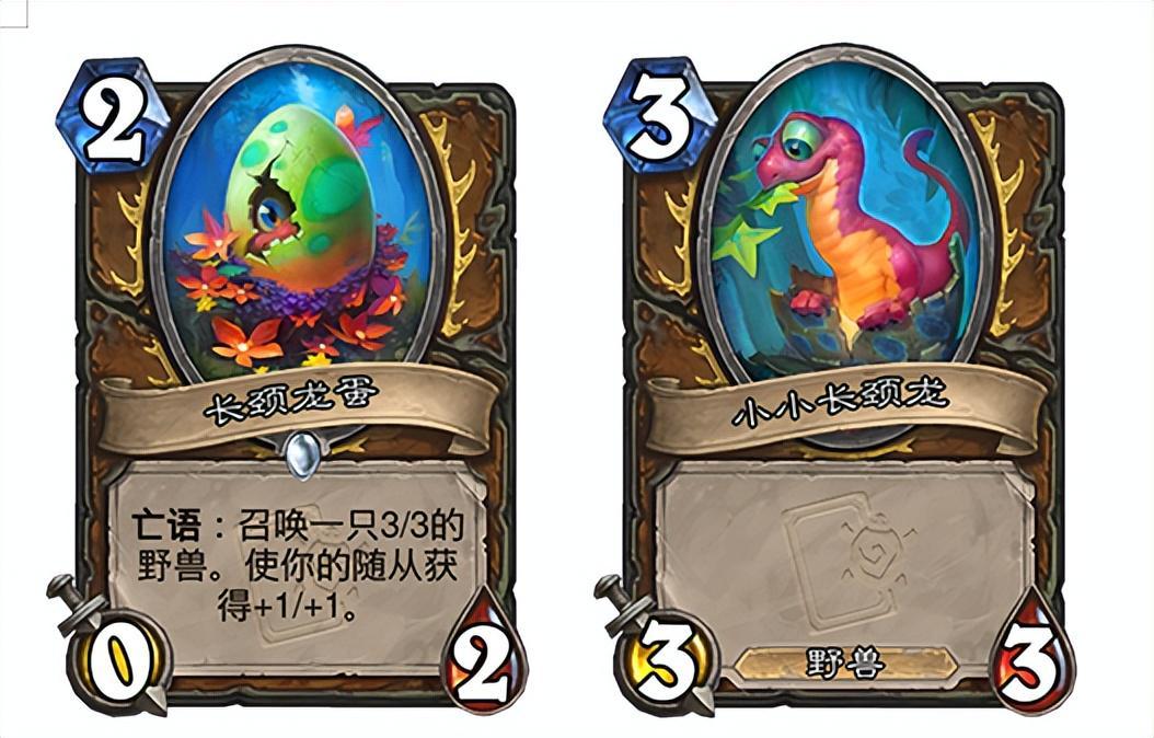 “长颈龙蛋”迎来质变级增强,孵化后的随从属性从3/3跃升至4/4,直接比肩经典卡牌“蛛魔之卵”。这张低费神卡预计将重塑衍生物卡组的构筑思路。