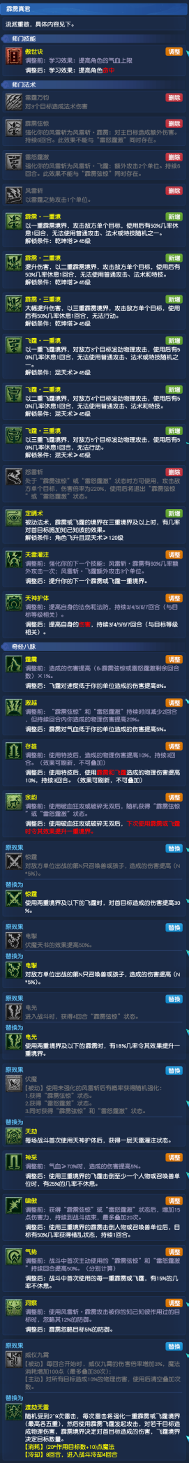 “踏雷天尊”流派的重做不仅限于此。师门技能【傲世诀】提供的额外气血属性被调整为命中,直接增强了伤害能力。原有的师门法术也被彻底重构,霹雳变为单体法术,伤害随境界提升;飞霆则为群秒技能,群秒个数随境界增加,三层可秒5。但使用后会有50%几率休息一回合。此外,该流派还获得了新的被动技能“定睛术”,部分师门技能也得到了优化。