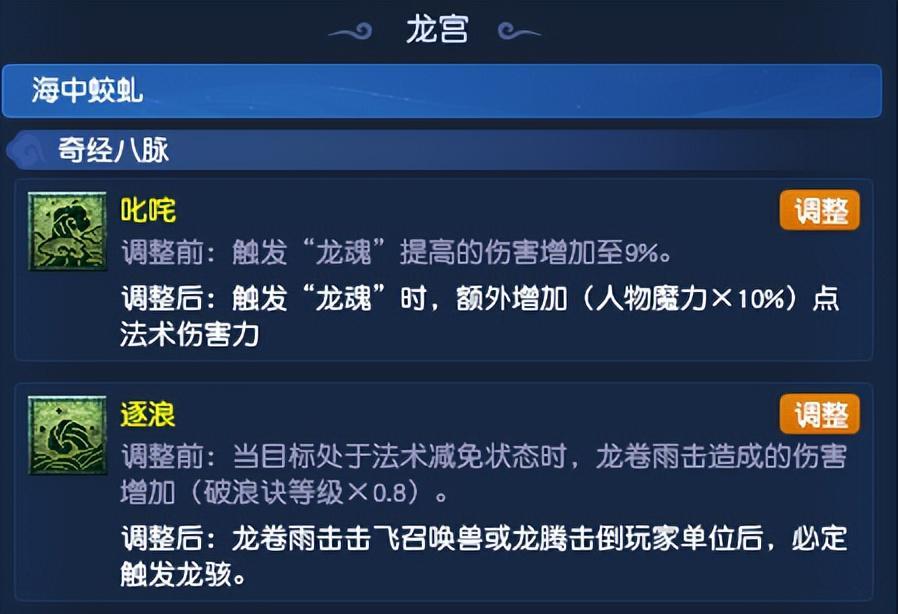 此次对龙宫的改动主要集中在输出能力上。“海中蛟虬”流派提升了【叱咤】经脉的输出能力,并将【逐浪】经脉重做为“龙卷雨击击飞召唤兽或龙腾击倒玩家后,必定触发龙骇”,有效提升了PK滚雪球能力。