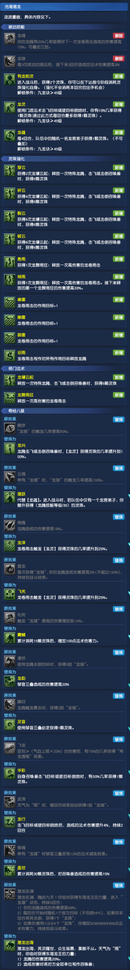 “沧海潜龙”流派则迎来了大幅重做。该流派玩家可消耗灵珠强化技能。被动技能方面,新增了【有龙则灵】(开局两个灵珠,强化不消耗出手机会)、【龙灵】(使用门派法术击飞或让目标倒地时,有10%几率获得1颗灵珠,每回合最多1颗)和【龙蕴】(每过4回合,队伍中随机一名龙宫弟子获得1颗灵珠)。