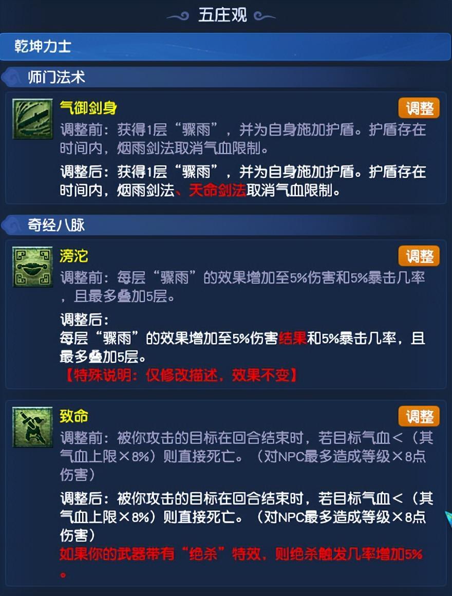 五庄观“乾坤力士”流派获得了小幅增强。【气剑御身】新增了取消天命剑法的气血限制功能,【致命】经脉则可增加武器绝杀特效的触发几率。