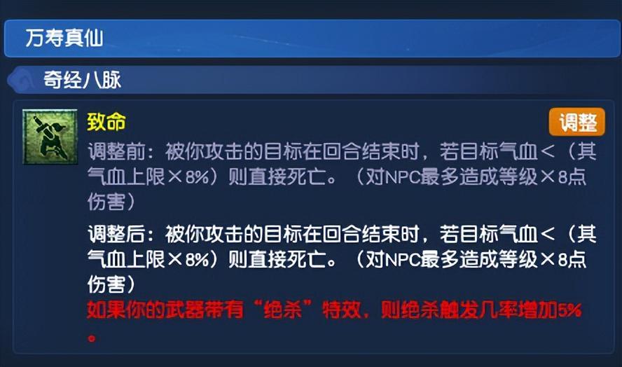 “万寿真仙”流派的【致命】经脉同样增加了武器绝杀特效的触发几率,进一步提升了输出能力。